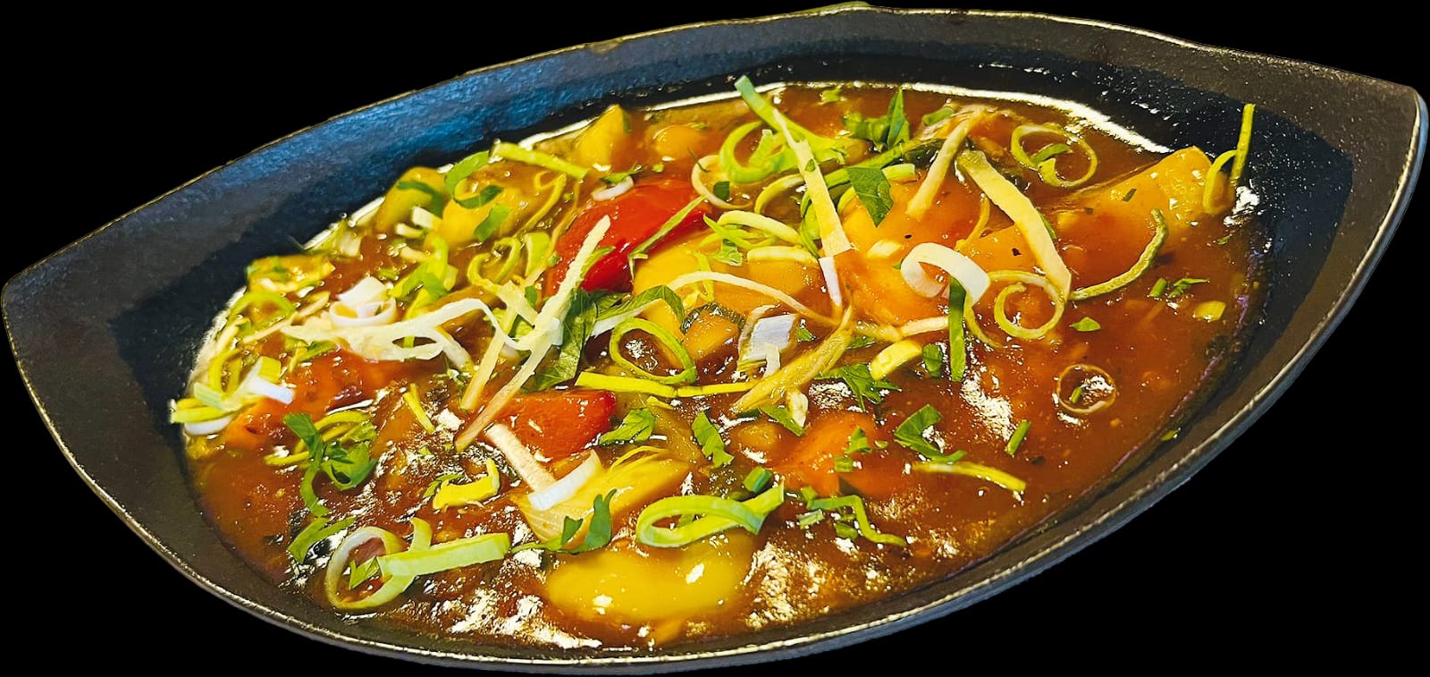 Entenbrustfilet mit Zwiebeln, Tomaten, Ingwer, Knoblauch, Erdnuss-Sauce und Sahne – leicht scharfg,h